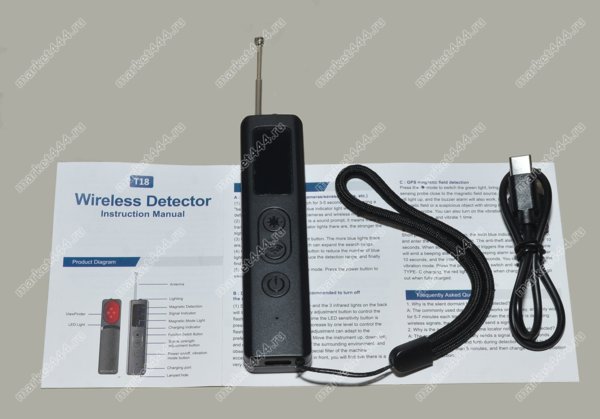 Режимы работы, поиска | 1) Электромагнитному излучению. 2) Магнитному полю. 3) Визуальный поиск скрытых микро видеокамер при ИК. 4) Фонарик. 5) Противоугонная сигнализация. |
