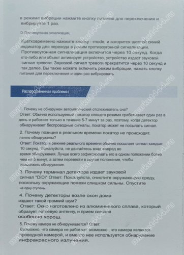 Рекомендация, особенность: Для того что бы искать GPS в режиме поиска источников э/м излучения необходимо оставить прибор включенным, что бы антижучок фиксировал трекер во время передачи данных на сервер пользователю. По периодичности срабатывания антижучка можно предположить, что в радиусе его действия установлен GPS слежения.